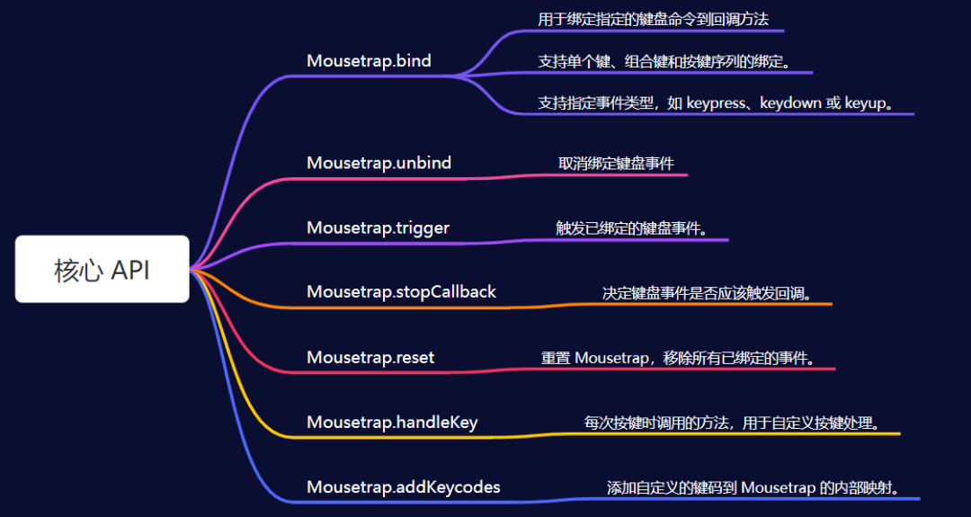 }, 'keydown');Mousetrap 提供很多的 API 帮助开发者灵活的创建和管理键盘快捷键,以下几个核心API:
