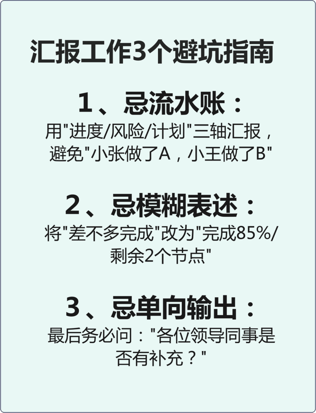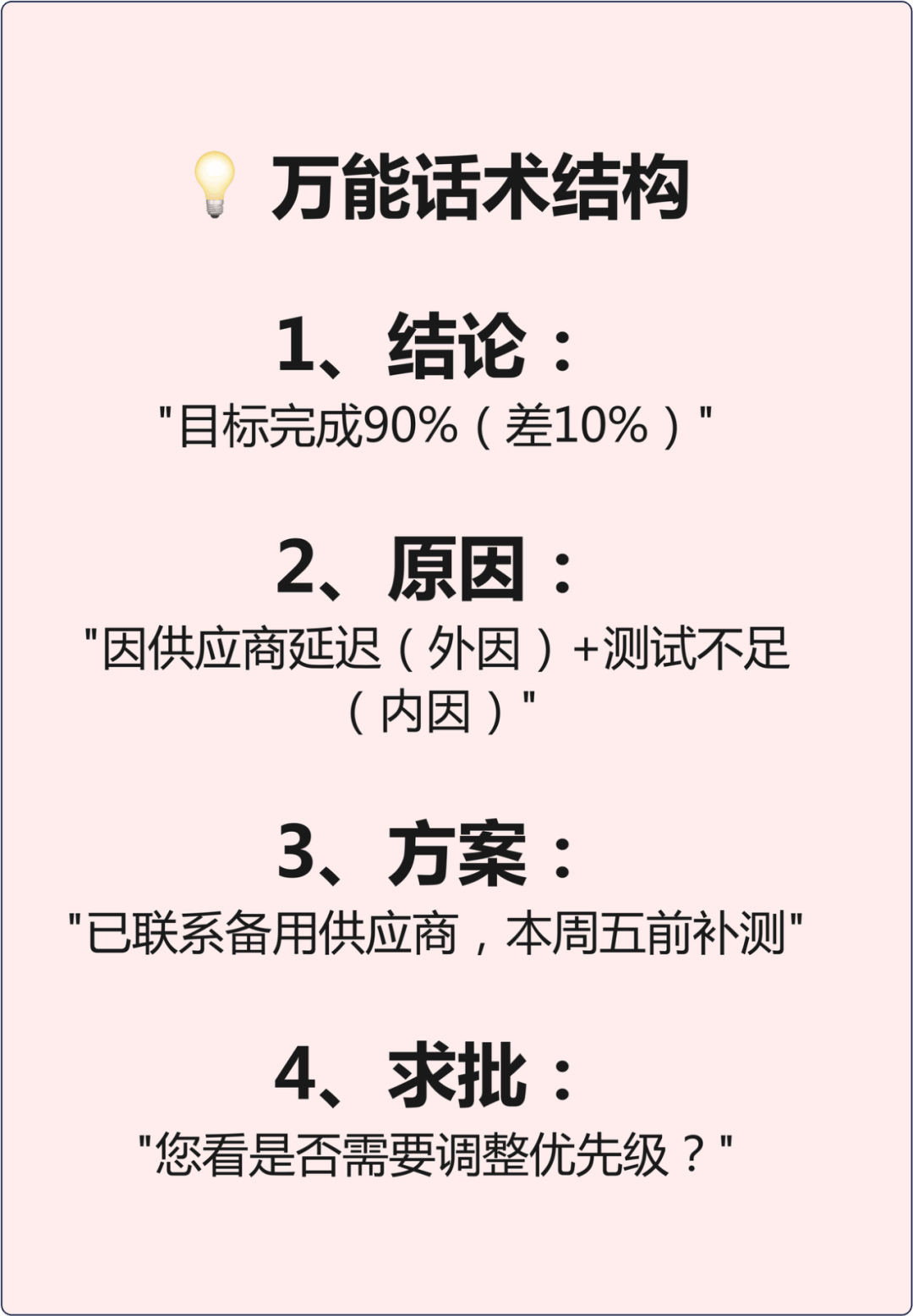 风险预警:提前说问题,但别光说“问题”,要加“影响”,比如“测试滞后会导致项目延期3天”。