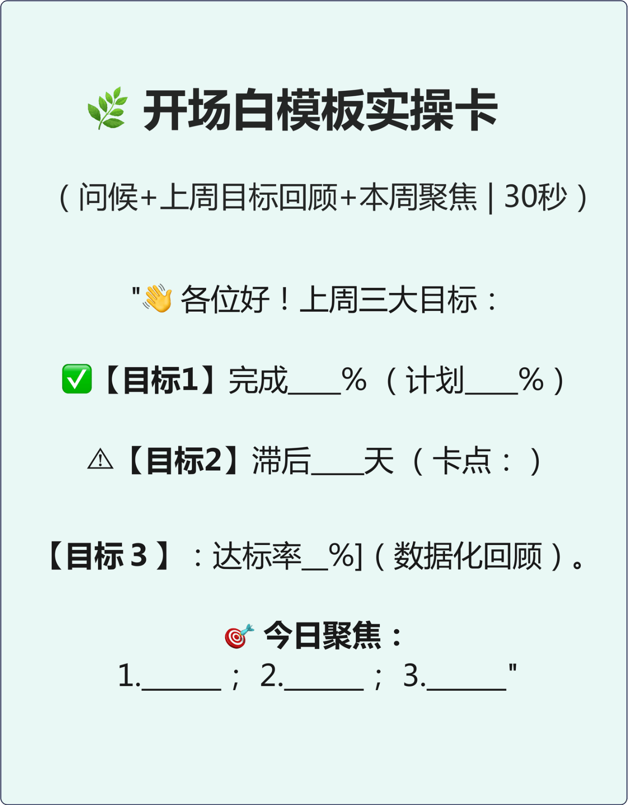 开场白公式=问候+上周目标回顾+本周聚焦(30秒)