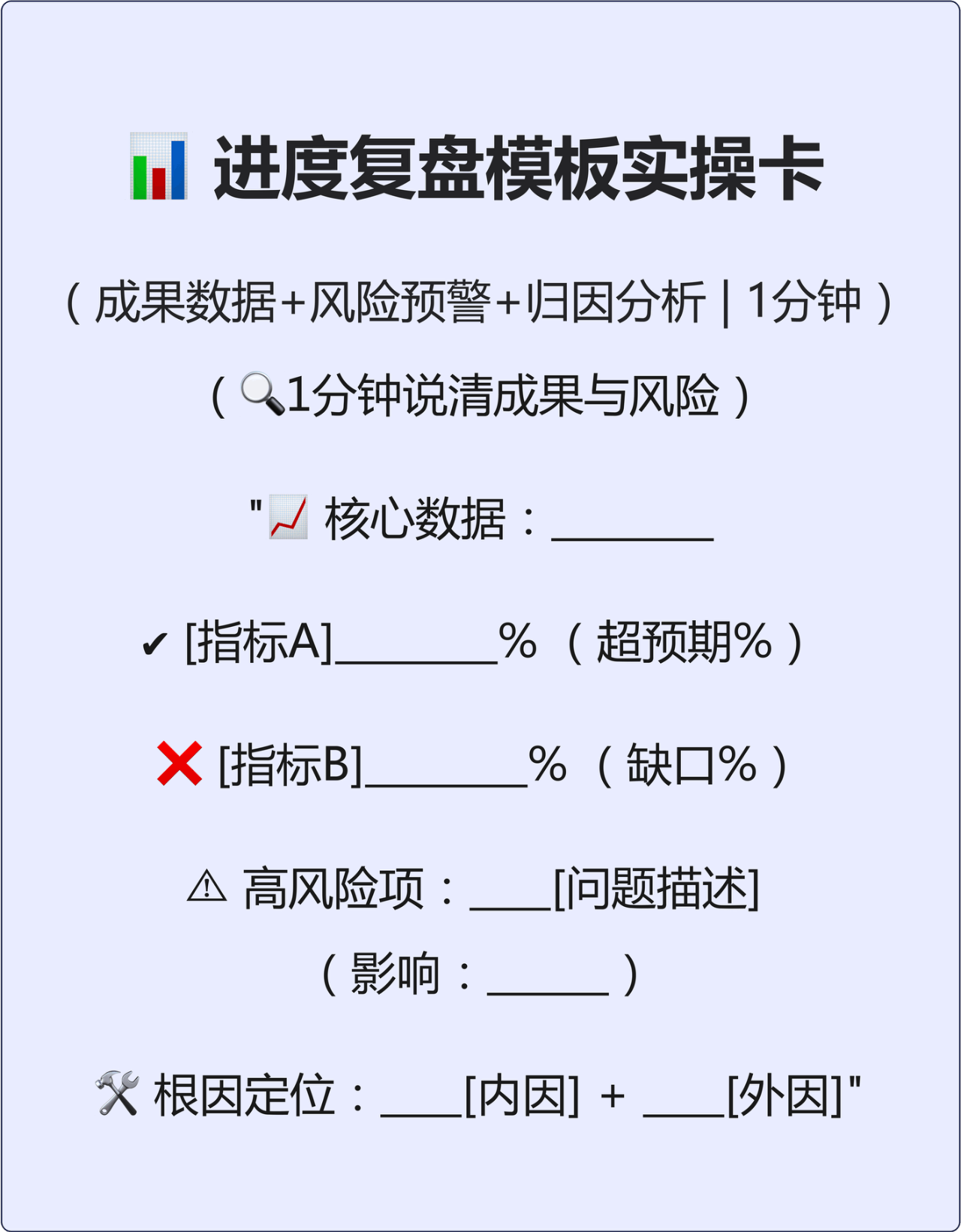 1、进度复盘公式=成果数据+风险预警+归因分析(1分钟)