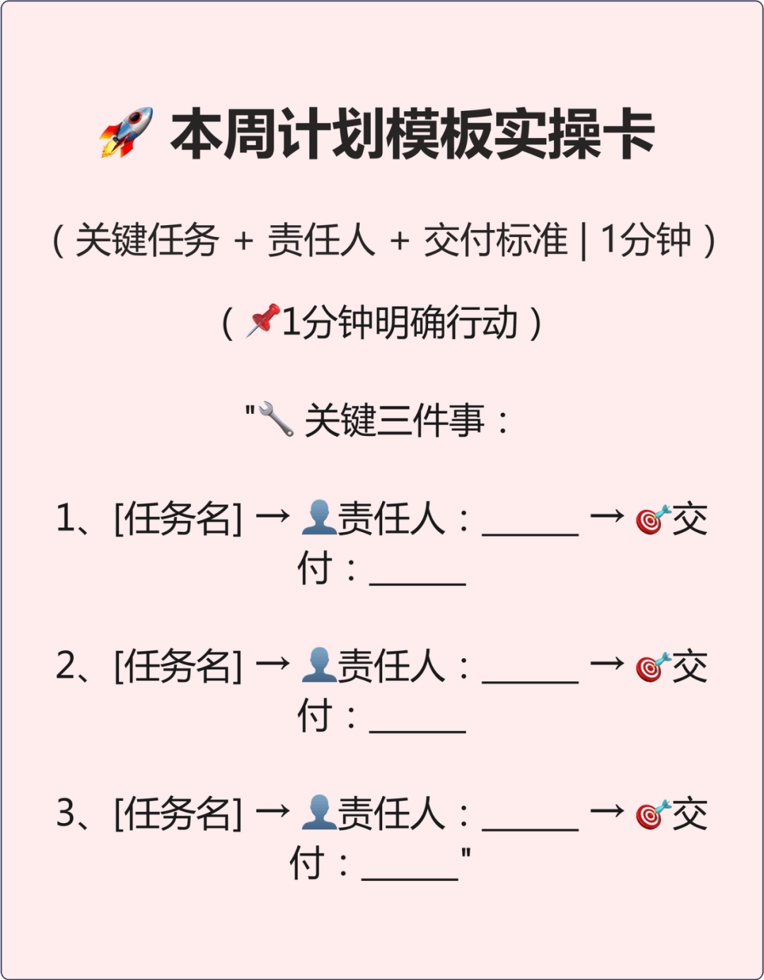 2、 本周计划公式=关键任务+责任人+交付标准(1分钟)
