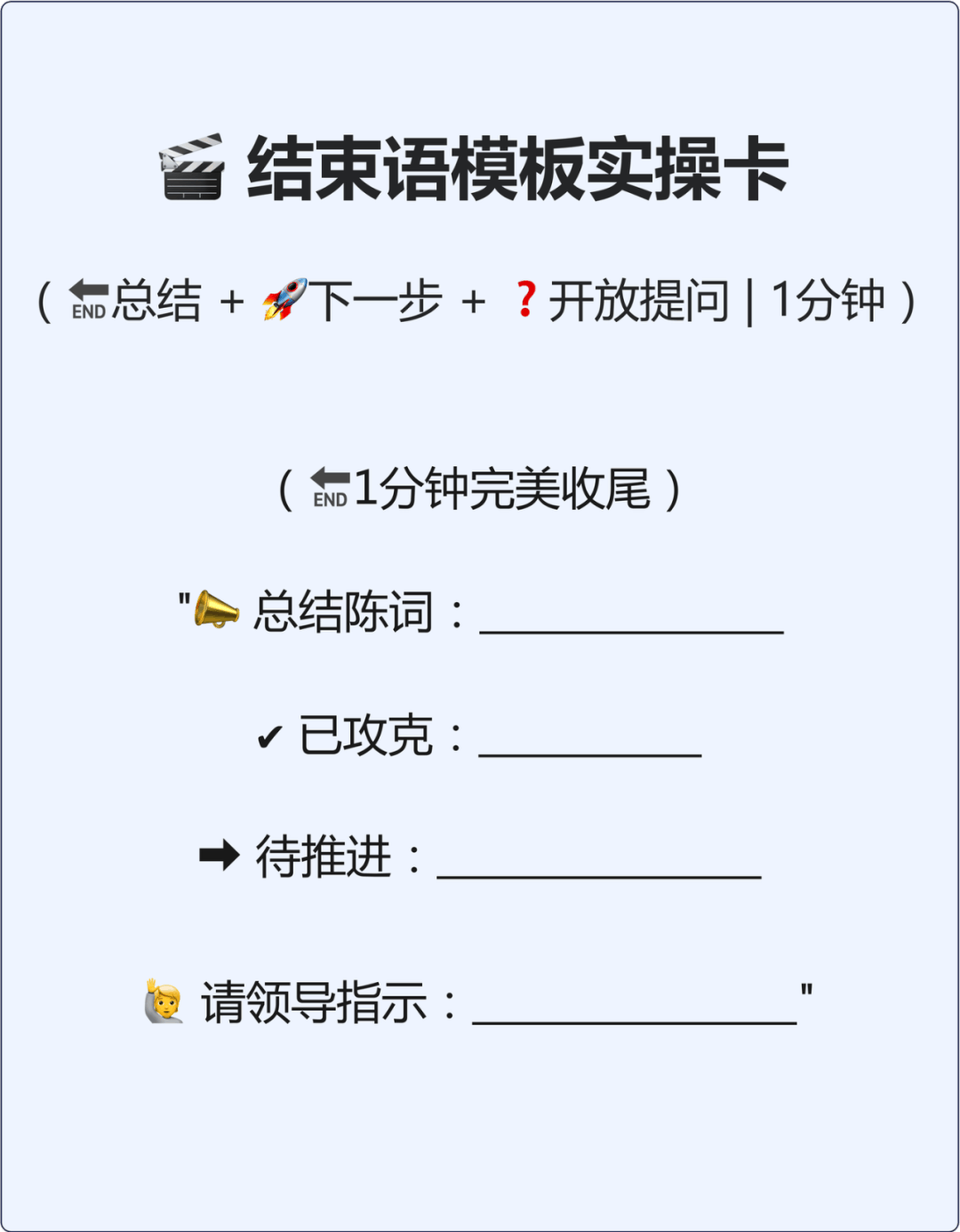 闭环收尾:总结+下一步+开放提问,体现管理者“会收尾”。
